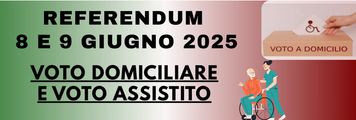 Ai sensi del decreto legge 3 gennaio 2006 n.1, convertito in legge 27 gennaio 2006 n.22, anche in occasione dei referendum abrogativi popolari dei giorni 8-9 giugno 2025, gli elettori affetti da grave infermità che ne renda impossibile l'allontanamento dall'abitazione possono essere ammessi a votare presso il proprio domicilio, presentando istanza al Sindaco del Comune di residenza (con allegato un certificato rilasciato dal funzionario medico, designato dai competenti organi dell'azienda sanitaria locale) dal 29 aprile 2025 al 19 maggio 2025.